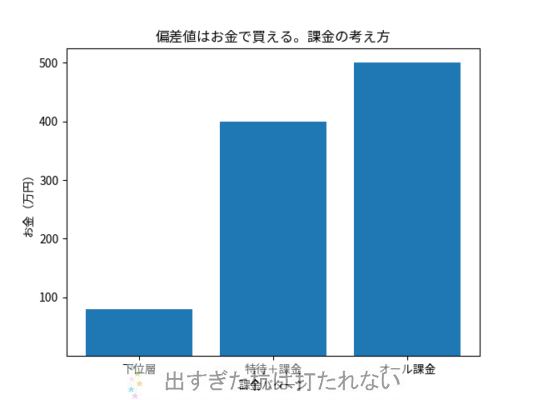 グラフは感覚で見てもらいたいのですが、課金下位層勢はおいといて、特待だろうがオール課金だろうが、教育投資は誤差レベルなんだろうなというのが話を聞いていて思ったことです。