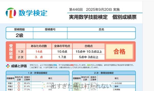 終わってから1週間しか数検の勉強期間はなく、学校のことも手を抜けないので、家にあった数検2級のテキストを一通りやっただけみたいです。